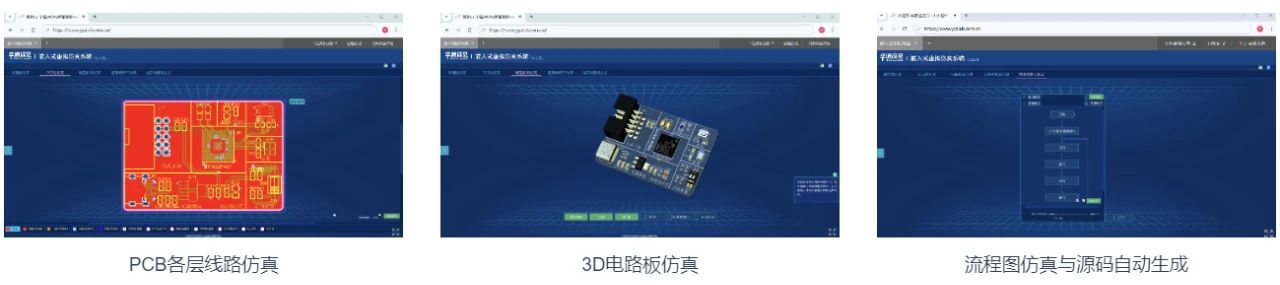 嵌入式虚拟仿真系统根据这个学习痛点,设计了全流程的仿真,搭建了完整的知识体系,涵盖了从3D电子元器件属性介绍,到芯片外设控制器工作原理与寄存器配置,再到原理图设计及连线仿真,以及PCB各层线路仿真、PCB 3D效果展示、流程图编程仿真,包括STM32CubeMX HAL库源码仿真,直至项目3D场景仿真(如智能灯光控制系统、智能大棚温控系统、火灾报警系统、智能小车)的全流程仿真。学员可以通过它学习一个产品从原理图、PCB设计,到接口开发、图形界面设计,再到顶层应用开发的完整流程。这种全流程的学习方式,使知识体系更加完整、全面,让学员对产品的开发过程有更直观、真实的感受。