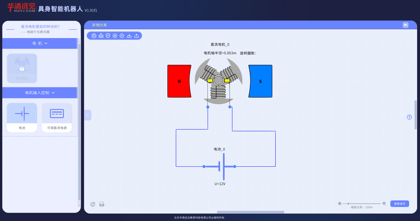 而华清远见具身智能机器人虚拟仿真系统的出现,彻底打破了这种教学困境。系统搭载了交互式电路设计功能,学生可以通过图形化连线的方式,自由搭建电机、电源、驱动、编码器的连接回路,整个过程直观清晰,不用害怕接线错误损坏设备;