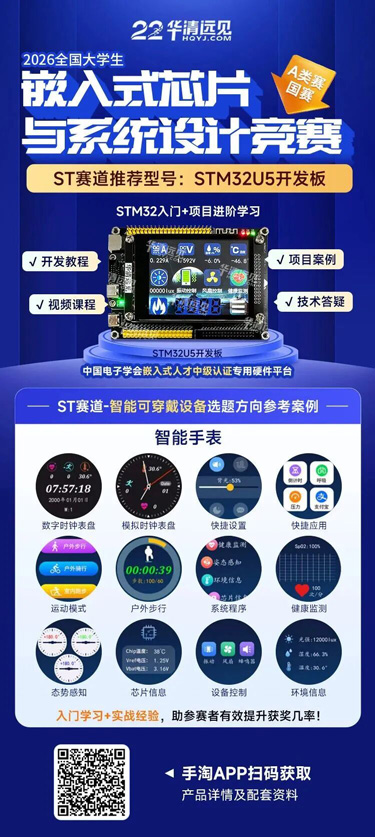 该开发板紧扣 ST 赛道赛题考核重点,围绕工程集成度、功耗优化、智能分析、感官交互四大核心指标打造配套资源,不仅提供 HAL 库、FreeRTOS、TouchGFX/LVGL 界面开发等核心技术学习资料,还配套智能手表原型项目及3个 LVGL 物联网项目案例,同时搭载 ST 官方联手华清远见打造的《嵌入式裸机编程》实战课程 —— 该课程也是中国电子学会嵌入式人才认证中级课程,学完可考取对应认证证书,实现 “备赛 + 能力认证” 双重提升。