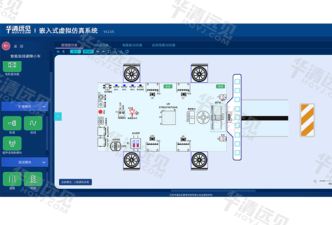 · 基础场景实训:2D 模式下完成红外循迹赛车系统搭建 —— 配置红外传感器、电机驱动模块与 STM32 控制核心参数,设定 “信号采集→方向判断→电机控制” 逻辑;切换至 3D 虚拟赛道场景,查看赛车循迹运行效果,解析控制指令交互逻辑;