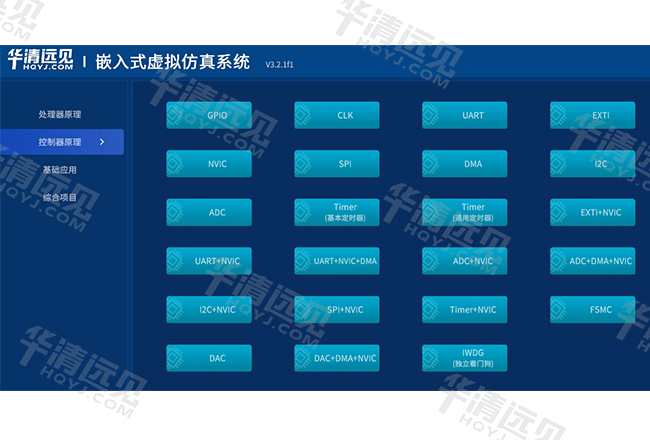 在实验项目管理界面,可以查看处理器原理、控制器原理、基础应用、综合项目四部分实验,按顺序路线图由浅到深再到综合项目,让教学更简单。